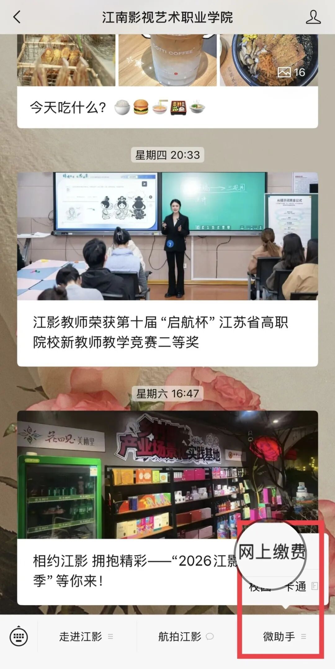 2、进入公众号,点击右下方的微助手-网上缴费,进入缴费登录界面。