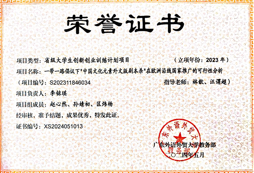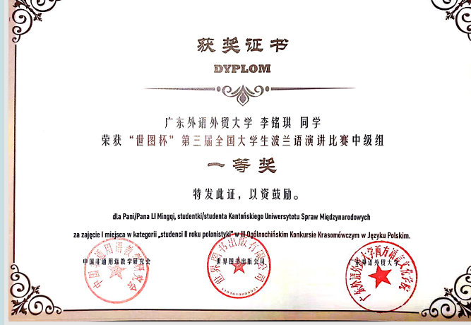 曾获国家奖学金、国家公派留学奖学金、全国波兰语演讲比赛一等奖、2023外研社英语辩论公开赛一等奖、省级大创项目(负责人)优秀结项等15项荣誉。