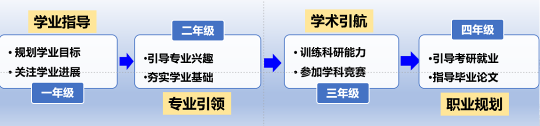 本专业推行覆盖全体本科生、贯穿四年教育全过程的导师制。学业导师从学业指导、专业引领、学术引航、职业规划等方面对学生进行指导,保障学生培养的个性化、精细化。
