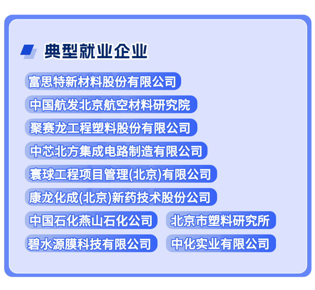 与多家新材料企业签订产学联合培养协议(如燕山石化公司、北京碧水源膜科技、北京富思特新材料、李尔汽车、城南橡塑、北京聚菱燕、雷诺丽特集团、北京中科纳通等),提供相关的实习、实践基地,并实现实习、毕设、就业一体化,支持学生工程实践能力的培养。