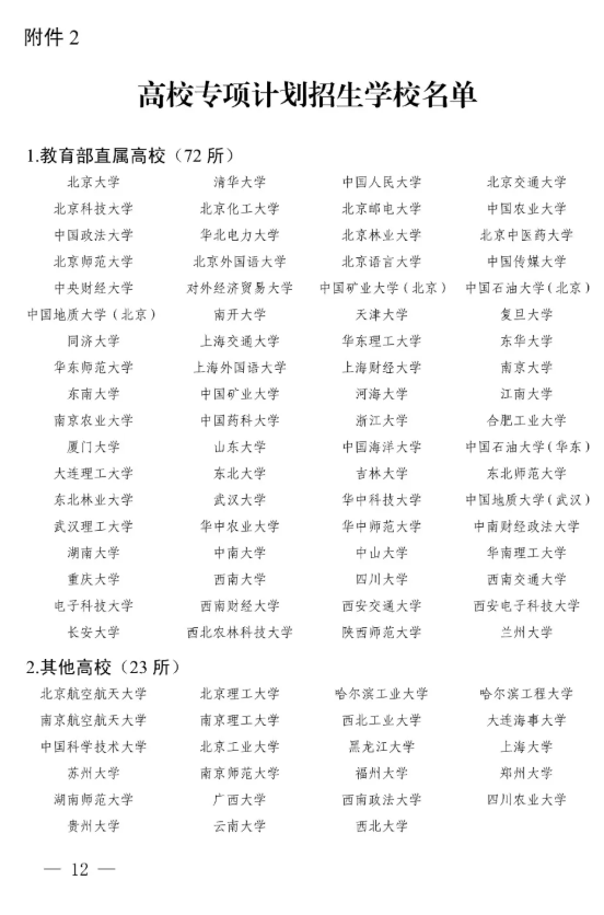 (一)国家专项计划定向招收原贫困地区学生。招生学校为中央部门所属高校和各省(区、市)所属重点高校,实施区域为我省原集中连片特殊困难县和原国家级扶贫开发重点县(共68个,名单见附件1),其报考条件为:申请考生具有我省实施区域当地连续3年以上户籍和当地高中连续3年学籍并实际就读、其父亲或母亲或法定监护人具有当地户籍、符合我省今年普通高考报名条件。