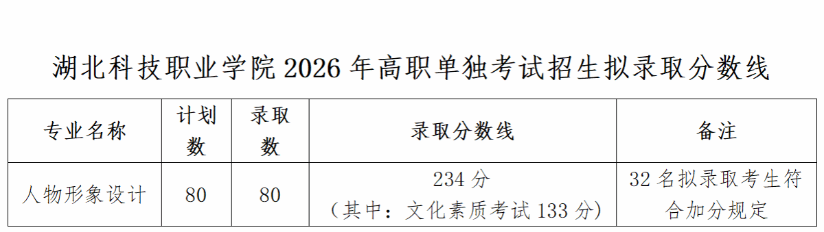 根据《省教育厅关于做好2026年高职院校单独考试招生工作的通知》(鄂教职成函[2026]1号)精神和《湖北科技职业学院2026年高职单独考试招生章程》录取规则,经学校单招工作领导小组审议,学校党委会审定,现对2026年高职单独考试招生拟录取分数线和拟录取名单进行公示。