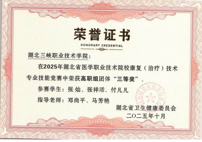 2023年10月团队教师指导学生参加湖北省医学职业教育康复治疗技术专业学生技能竞赛荣获团体一等奖、个人一、二、三等奖及“优秀指导教师”;2024年获世界职业院校技能大赛湖北省(高职组)选拔赛第一名;世界职业院校技能大赛(高职组)总决赛争夺赛铜奖;2025年获“中银杯”湖北省职业院校技能大赛高职组康复治疗技术赛项学生抽测组一等奖、学生推荐组二等奖;湖北省医学职业教育康复治疗技术专业学生技能竞赛团体三等奖;2026年获“中银杯”湖北省职业院校学生技能大赛高职组康复治疗技术赛道三等奖。