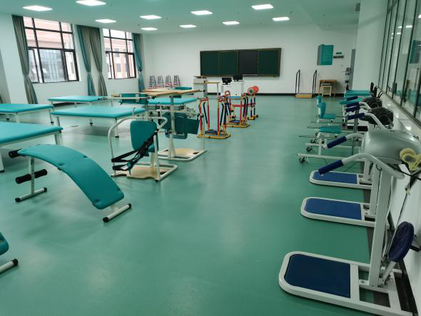 校内实训中心总建筑面积约2500平方米,实训室设备总值达1000万元。包括人体运动学实训室、康复评定实训室、运动治疗实训室、物理因子治疗实训室、作业治疗实训室、言语治疗实训室、康复工程实训室、人体发育学实训室、日常生活实训室。主要设备有脑机接口上下肢训练设备、外骨骼机器人、肌张力虚实结合训练设备、数字解剖人、智能磨砂板、虚拟现实平衡训练设备、机械手、平衡功能评定训练系统、认知评定训练系统、手功能作业评定箱等。每间实训室均可容纳30位及以上学生。承担了康复治疗技术专业所有实训课程的教学任务。