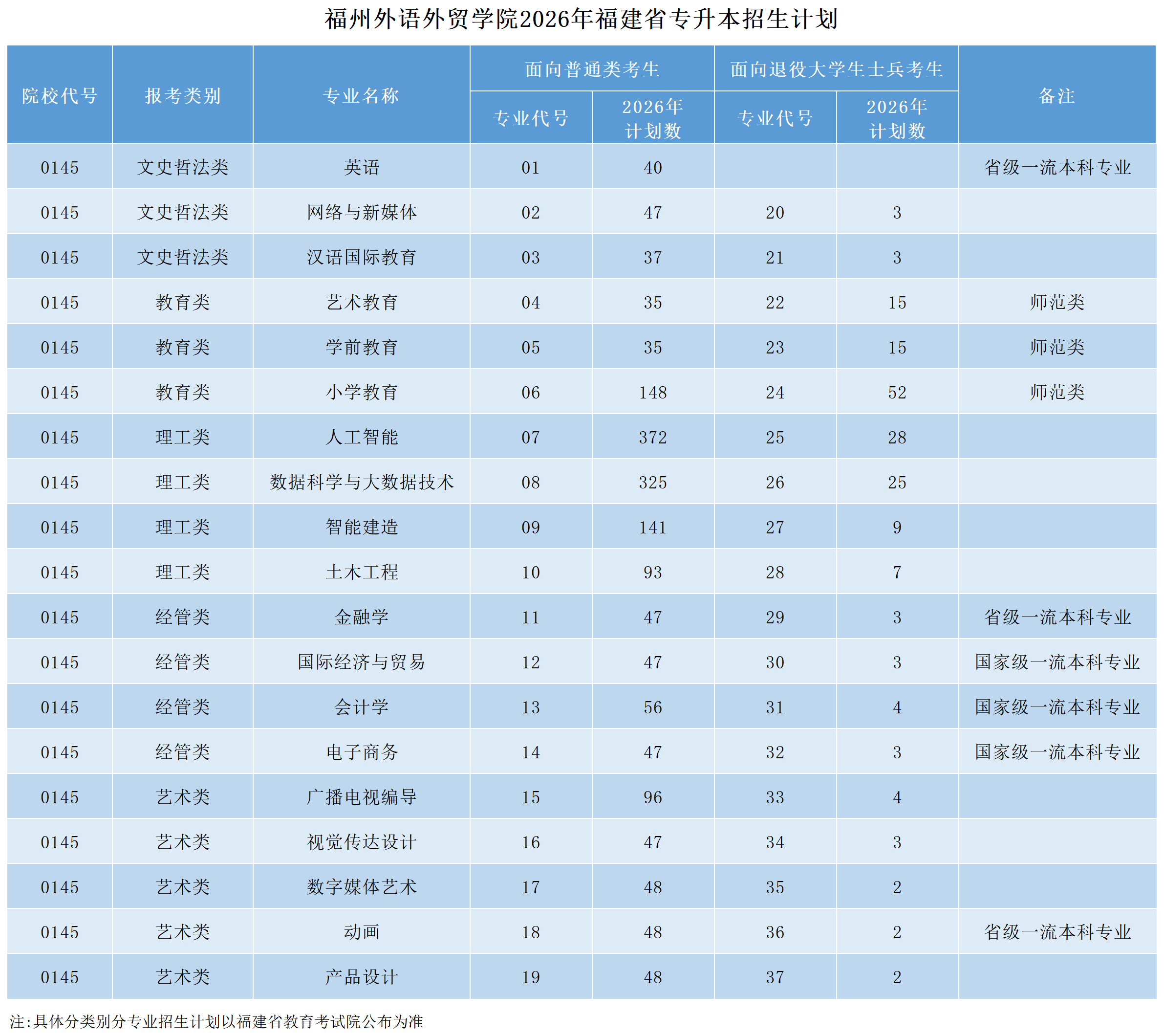 2026年福建省专升本招生计划