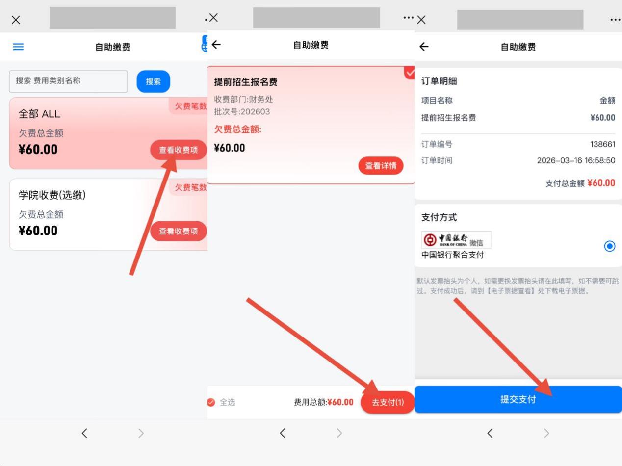 2、缴费:点击左上角的三条横线,选择自助缴费,会出现需要缴费的项目,点击对应的收费项去支付(可以选择全部缴费,也可以选择某一收费项进行缴费)、点击去支付,选择支付方式支付宝支付需要使用网页版缴费可看下面网页端缴费)、填写开票信息(默认开票信息是个人),提交支付支付完成即可。点击缴费查询可以查询到已经缴款成功的收费项。