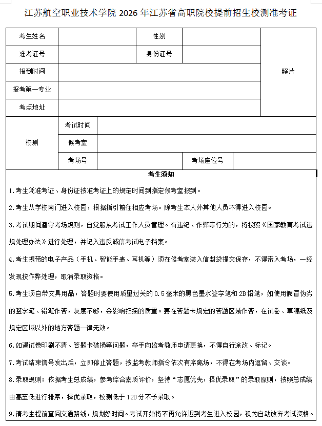 根据江苏省教育厅《关于做好江苏省2026年高职院校提前招生改革试点工作的通知》和《江苏航空职业技术学院2026年高职院校提前招生简章》的有关规定,为确保你顺利参加江苏航空职业技术学院2026年高职院校提前招生(第二轮)综合素质测试(以下简称校测),根据学校2026年提前招生(第二轮)工作安排,现将校测流程事宜告知如下,请你仔细阅读并严格遵照执行。