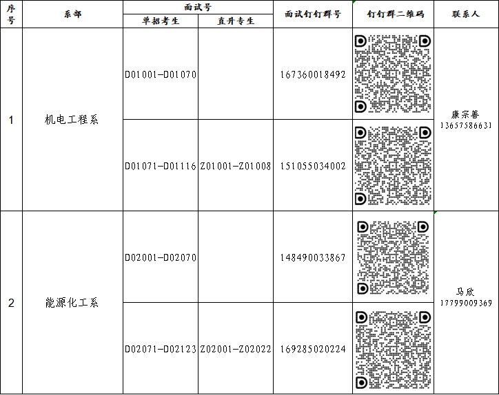 根据自治区教育厅、自治区教育考试院下发的《关于做好自治区2026年普通高职(专科)单独招生工作的通知》《关于做好2026年优秀毕业生直升高职(专科)招生工作的通知》文件精神。现将我院2026年高职单招、直升专招生线上面试工作安排通知如下: 一、我院2026年单独招生、直升专招生综合素质评价考试采用钉钉App线上面试方式进行。 二、面试时间:4月18日10:00-4月18日20:00。 三、已报名的考生请于4月17日12时前使用本人实名认证账号登录钉钉APP,在如下所示表格中查找自己所在考场及钉钉面试群等相关信息,使用钉钉App搜索该群号(或扫描相应二维码),查找公开群组,修改钉钉昵称为“面试号”,申请加入面试钉钉群,并按要求核准相关信息。考生因个人原因未申请进入钉钉群、没有进行线上面试,视同缺考。所造成的后果由考生自行承担。 四、面试期考生务必保持手机网络信号畅通,全天登录钉钉用户,随时保持钉钉用户开启模式,考试当天及时接听考场呼入信号,考场连续2次呼叫未及时接通的考生,我院将在考试结束前再呼叫1次,如仍未接通,则视为自动放弃考试资格。考试开始前学院老师会与各位考生取得联系,请各位考生实时关注考试动态。 五、如遇问题可在4月15日至17日每天10:00—19:00拨打下表各考场联系人电话解决。 六、学院招生就业处联系电话:0997-7700292 七、考生面试号详见附件。