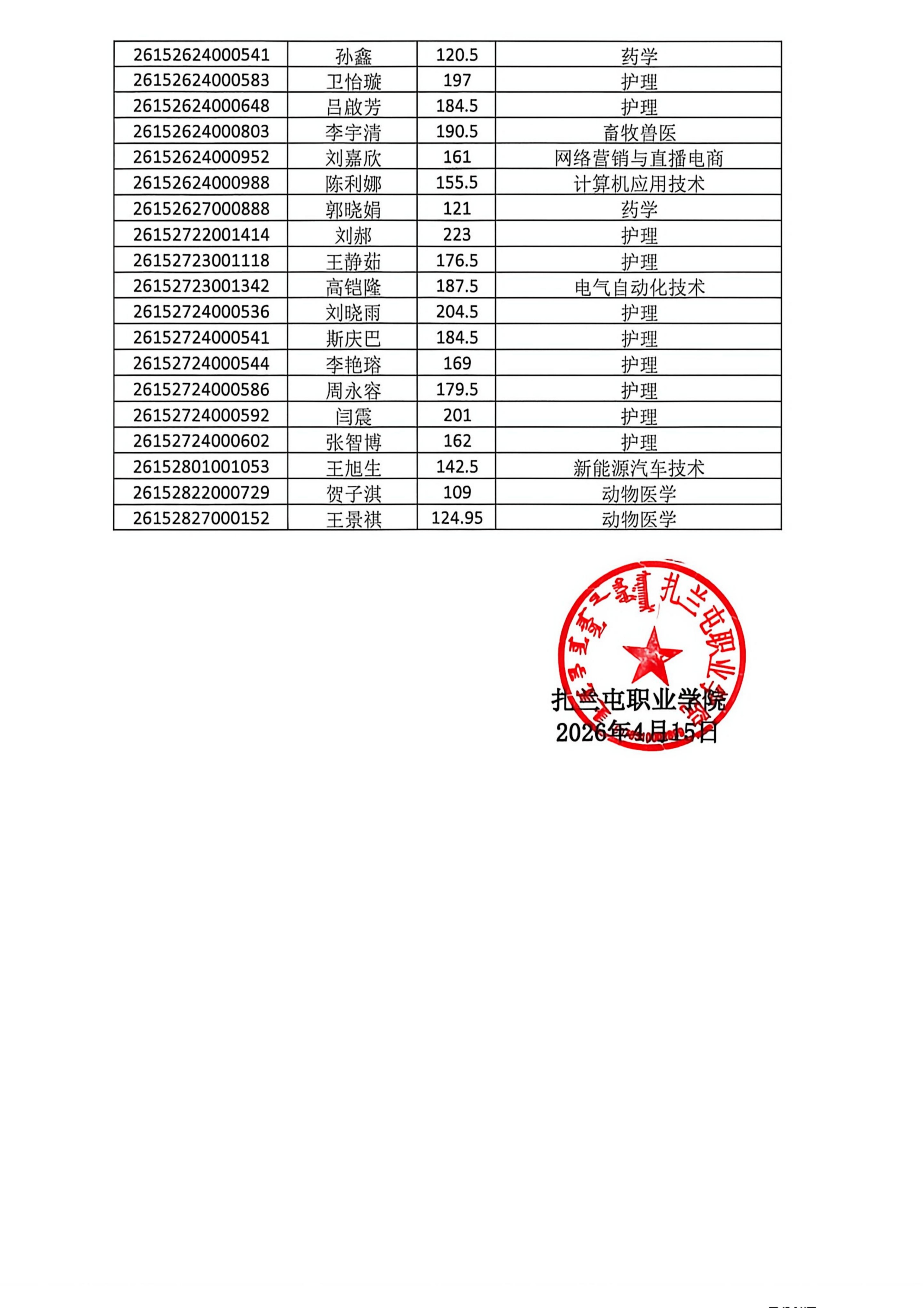 扎兰屯职业学院2026年二次单招成绩录取公示