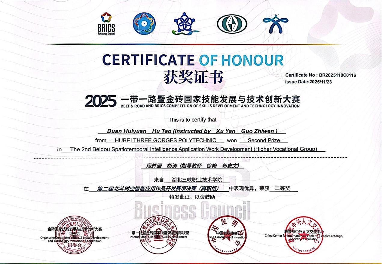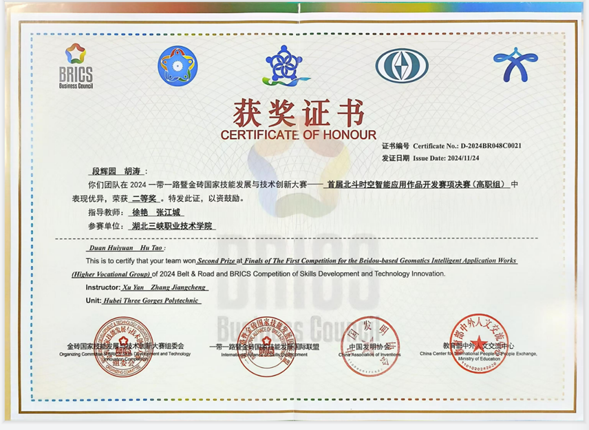 2024年及2025年一带一路暨金砖国家技能发展与技术创新大赛——首届北斗时空智能应用作品开发赛(高职组)荣获国家级二等奖。