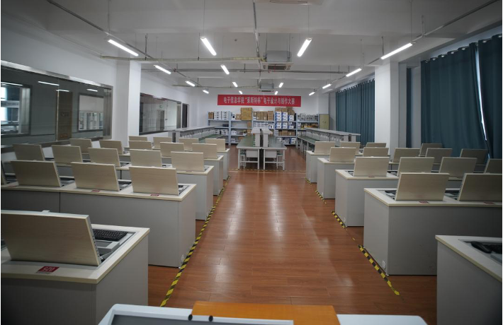 电子设计实训室:主要包含计算机、示波器、直流电源、电烙铁、信号源、电子技术实验箱、数字电路实验箱等。培养学生仪器仪表的使用、数字电路设计相关技能。