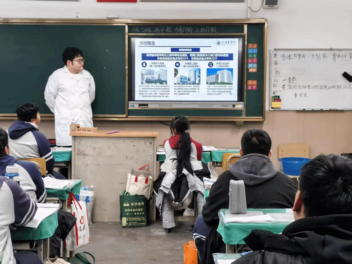 ②宣讲过程:活动当天,我们利先介绍沈医的历史、专业、师资与就业,重点讲解优势专业;再分享校园生活、科研成果与学习实践经验;最后互动答疑,同学们踊跃提问,我们逐一解答,现场氛围热烈,大家对沈医兴趣浓厚。