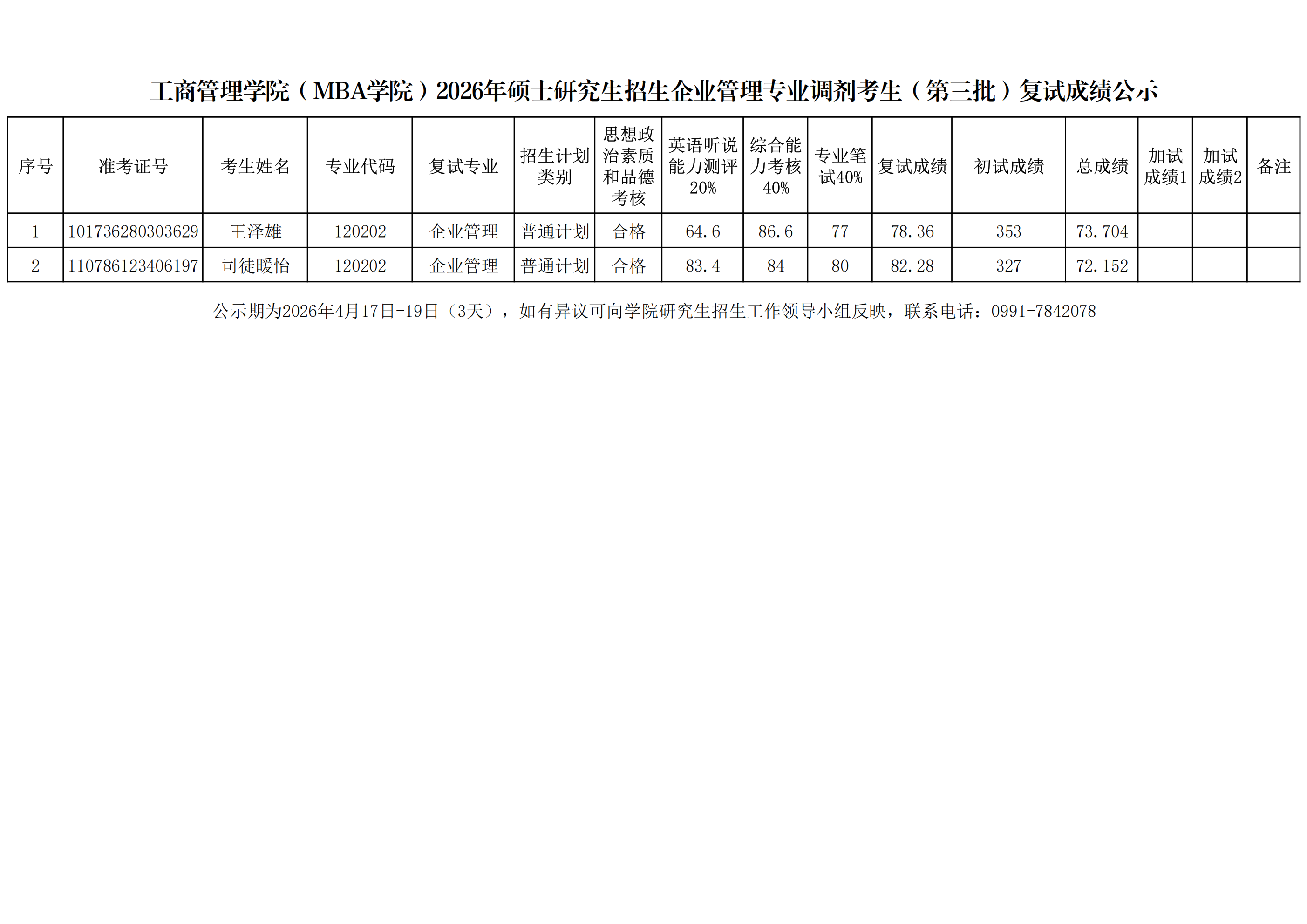 工商管理学院(MBA学院)2026年硕士研究生招生企业管理专业调剂考生(第三批)复试成绩公示
