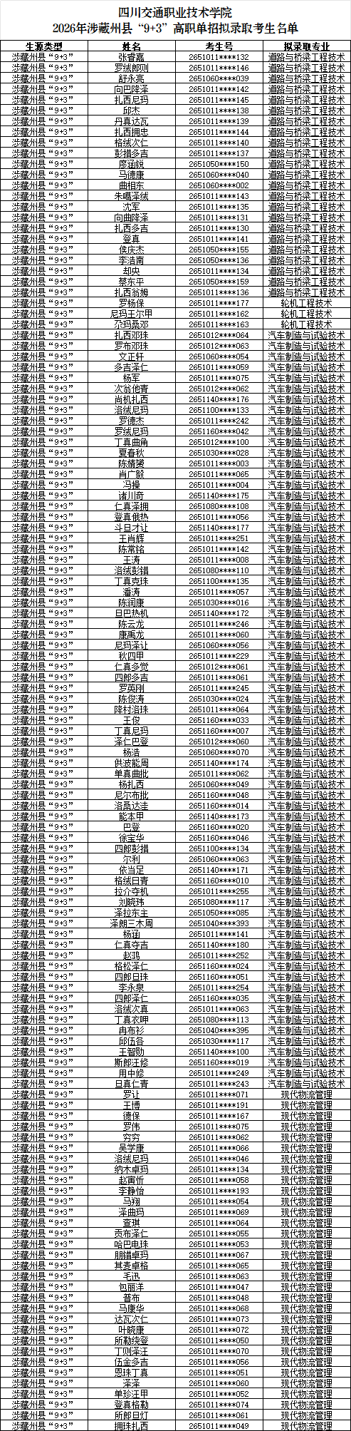 2026年涉藏州县“9+3”单独招生拟录取名单