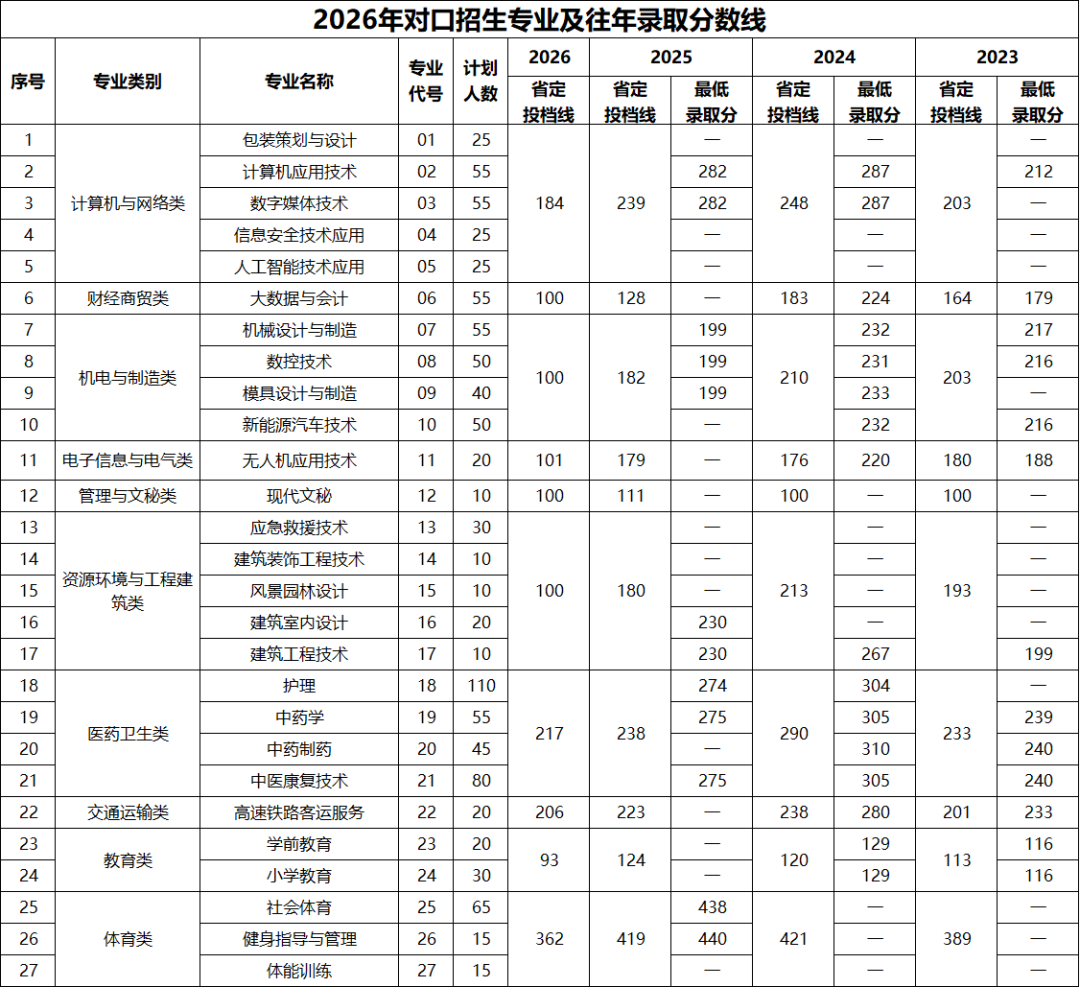 三、对口招生专业计划及往年录取分数线