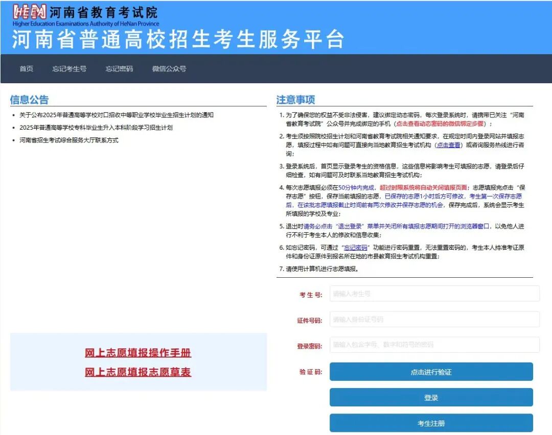 进入考生服务平台后,请仔细阅读“信息公告”区、“注意事项”区发布的政策公告和注意事项。