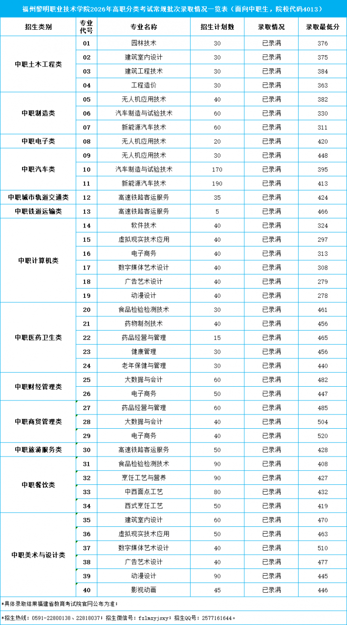 福州黎明职业技术学院2026年高职分类考试常规批次录取情况一览表(院校代码4013)