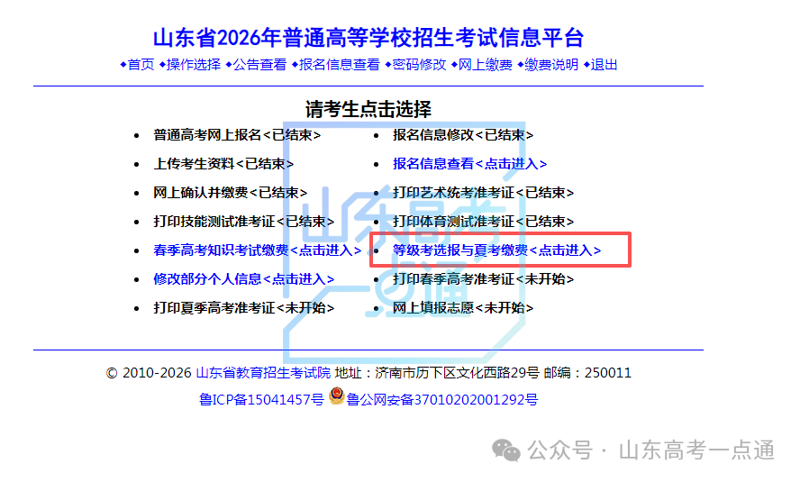 点击右侧中间“考生点击此处进入平台”打开考生操作选择页面。点击“等级考选报与夏考缴费<点击进入>”,如下图: