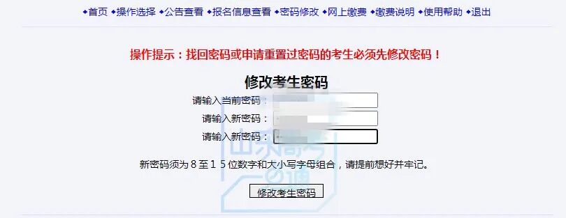 填好考生信息,点击修改密码后,显示操作成功,即为修改密码成功。如下图: