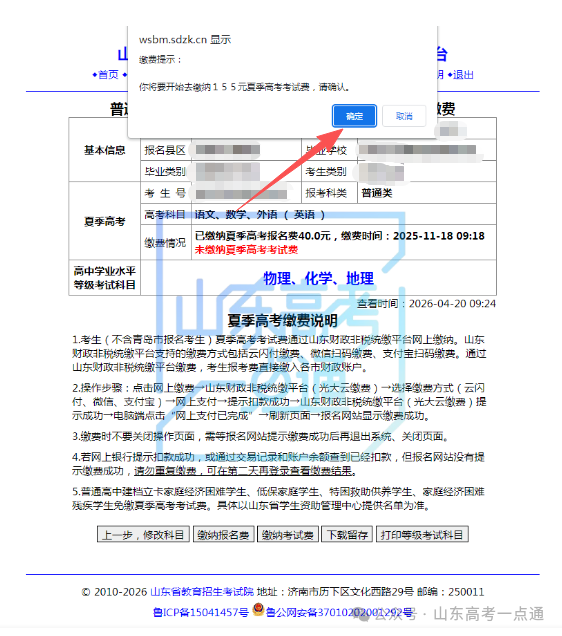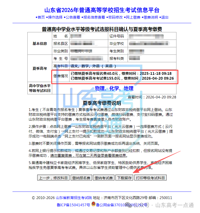 页面三:查看确认学业水平等级考试科目一夏季高考缴费一下载留存学业水平等级考试科目。
