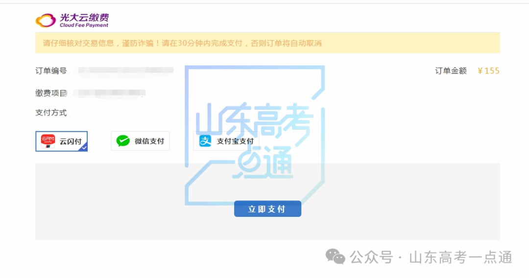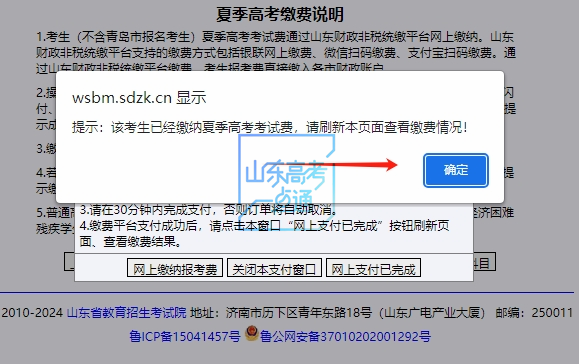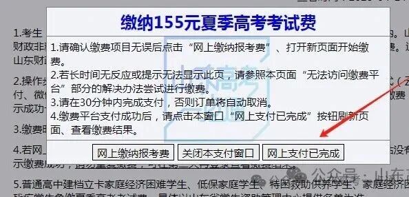 1、考生(不含青岛市报名考生)夏季高考考试费通过山东财政非税统缴平台网上缴纳。山东财政非税统缴平台支持的缴费方式包括银联网上缴费、微信扫码缴费、支付宝扫码缴费。通过山东财政非税统缴平台缴费,考生报考费直接缴入各市财政账户。2、操作步骤:点击网上缴费→山东财政非税统缴平台(光大云缴费)→选择缴费方式(银联、微信、支付宝)→网上支付→提示扣款成功→山东财政非税统缴平台(光大云缴费)提示成功→报名网站提示缴费成功。3、缴费时不要关闭操作页面,一直要等到报名网站提示缴费成功后再退出系统、关闭页面。4、若网上银行提示扣款成功,或通过交易记录和账户余额查到已经扣款,但报名网站没有提示缴费成功,请勿重复缴费,第二天再登录查看缴费结果。5、普通高中建档立卡家庭经济困难学生、低保家庭学生、特困救助供养学生、家庭经济困难残疾学生免缴夏季高考考试费。具体以山东省学生资助管理中心提供名单为准。八、高考缴费