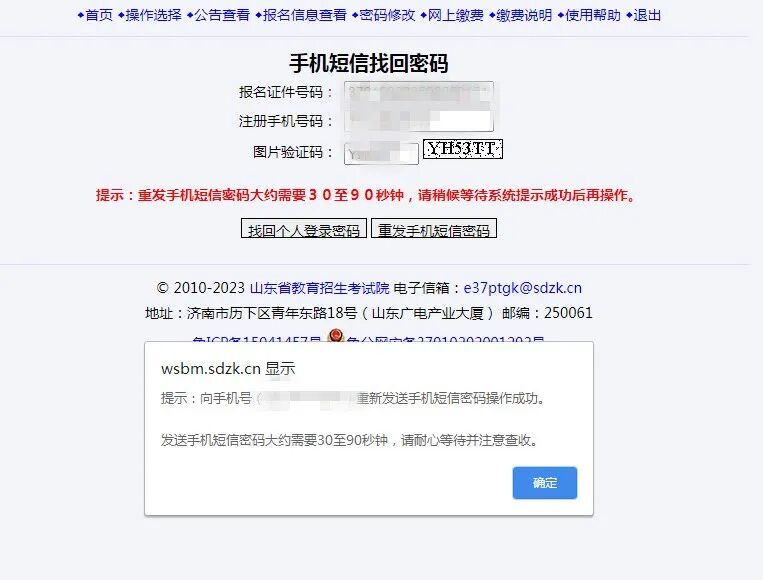 填写报名证件号码、注册手机号码、图片验证码,点击确定按钮。如下图: