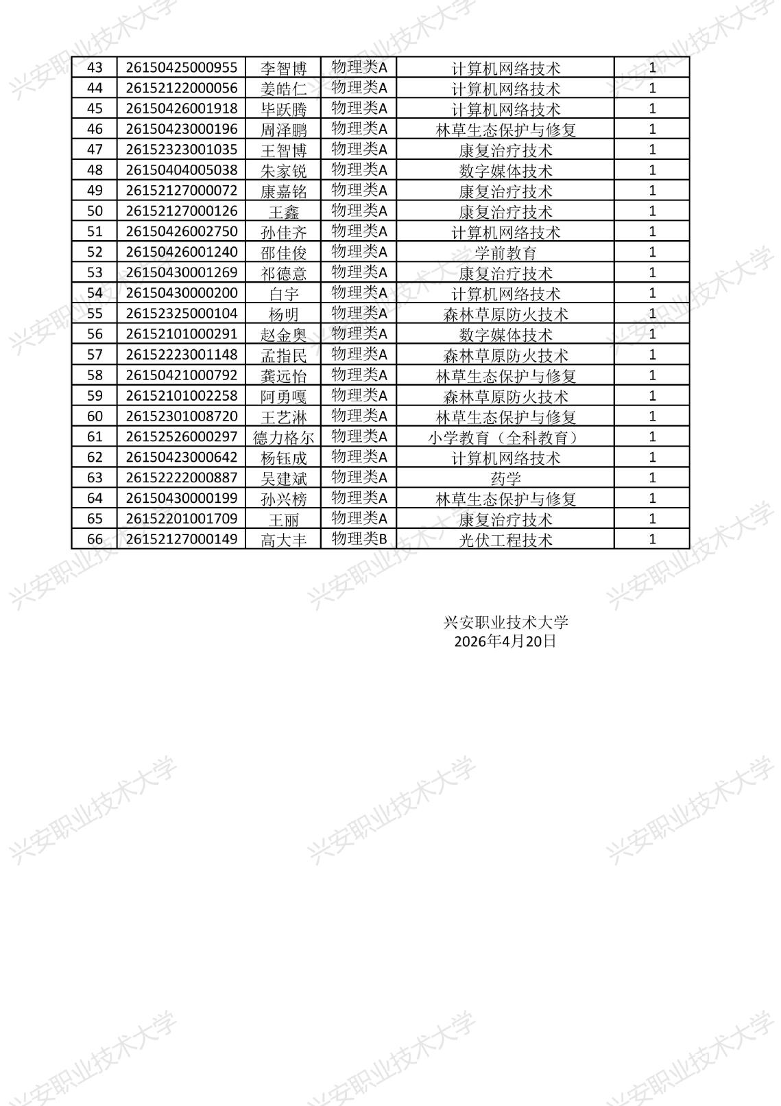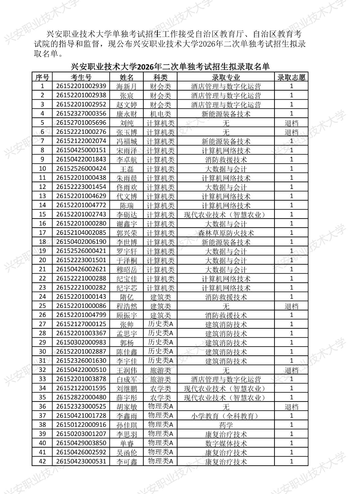 兴安职业技术大学2026年二次单独考试招生拟录取名单