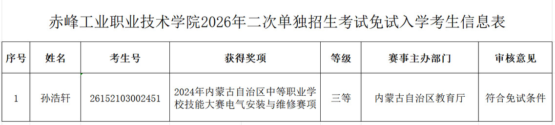 根据自治区教育厅相关文件精神和《赤峰工业职业技术学院2026年高职单独考试招生工作实施方案》要求,经学院招生工作委员会审定,对符合我院2026年二次单独招生考试免试条件的考生名单予以公示。