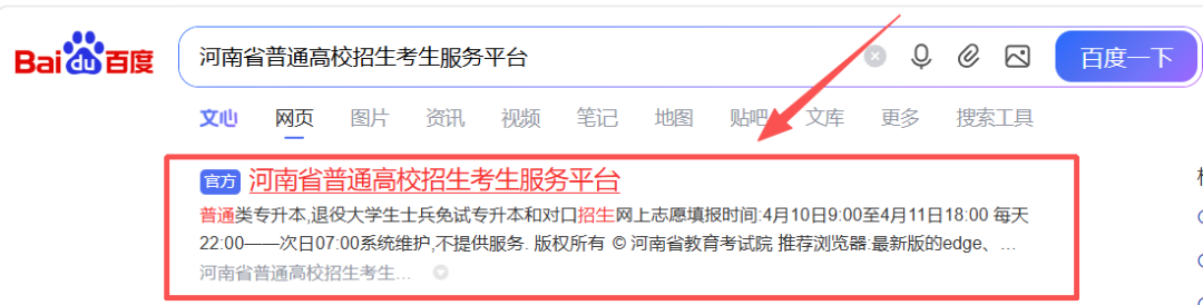 考生登录河南省普通高校招生考生服务平台(https://pzwb.haeea.cn/stu),或在搜索引擎中输入“河南省普通高校招生考生服务平台”,点击带有“官方”标识的网站。