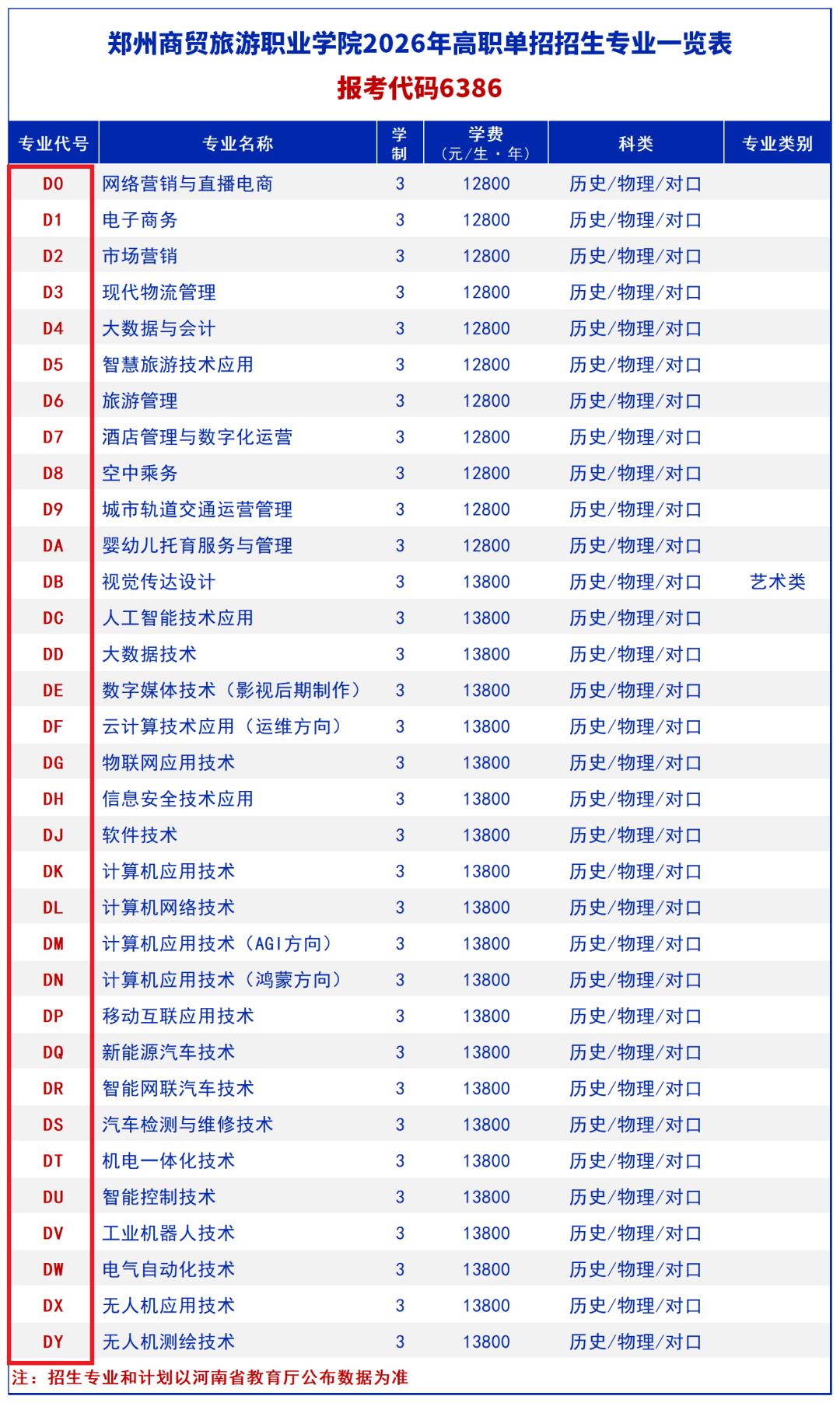 欢迎报考郑州商贸旅游职业学院!学校代码:6386 咨询电话:0371-67822631 67822632我们将为您提供权威、细致、全面的报考指导