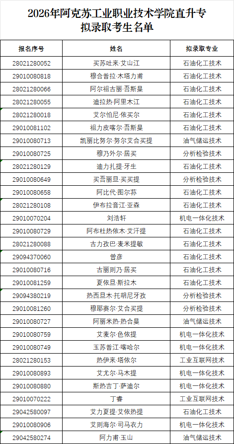 如有异议,请于公示期内与阿克苏工业职业技术学院招生就业处联系。