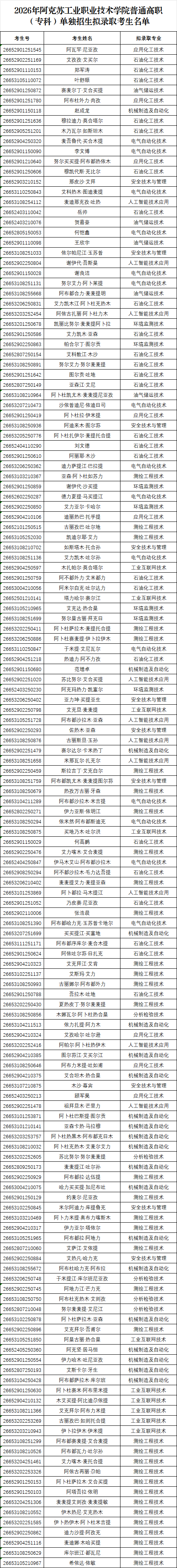 根据自治区《关于做好2026年普通高职(专科)单独招生工作的通知》精神,按照我院2026年普通高职(专科)单独招生工作进度安排,现将2026年高职单招拟录取考生名单予以公示,公示时间:4月22日—25日。公示期内,考生如有异议,请在工作日拨打联系电话:0997-7700292