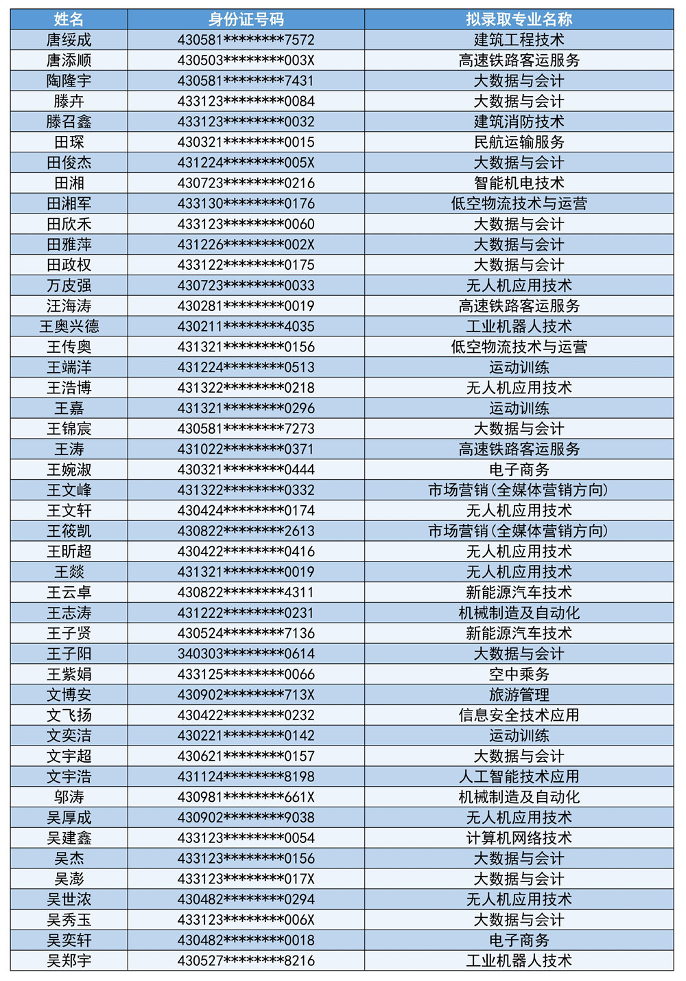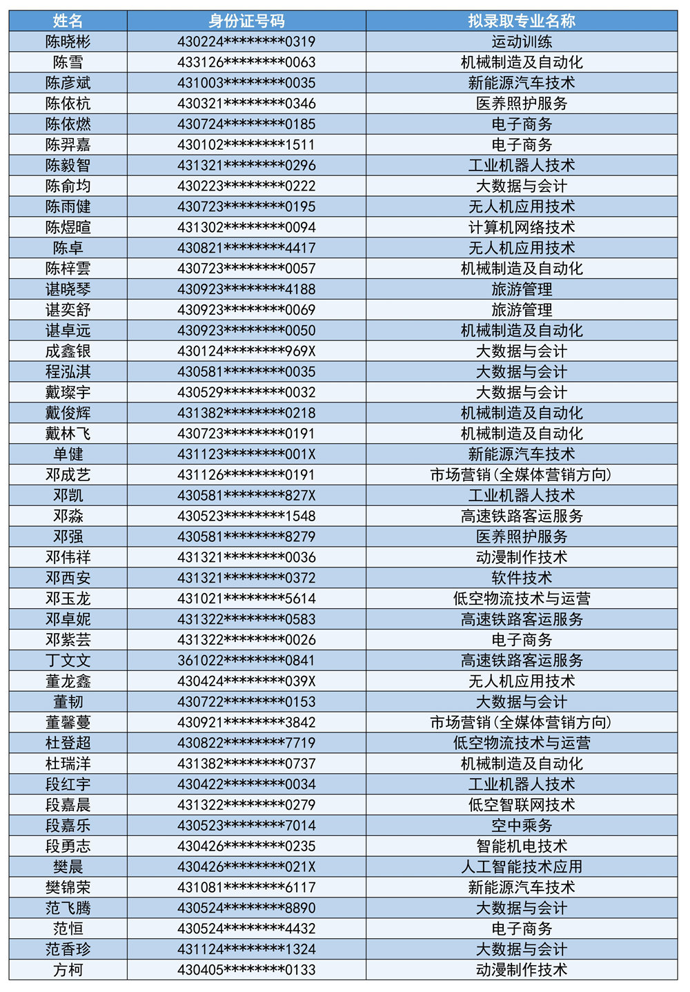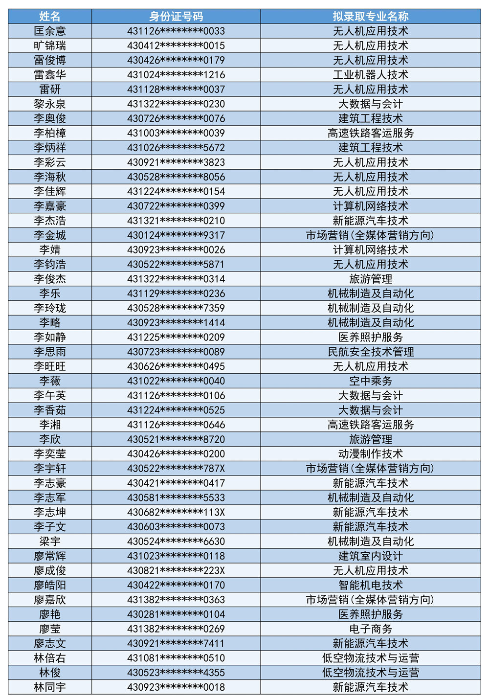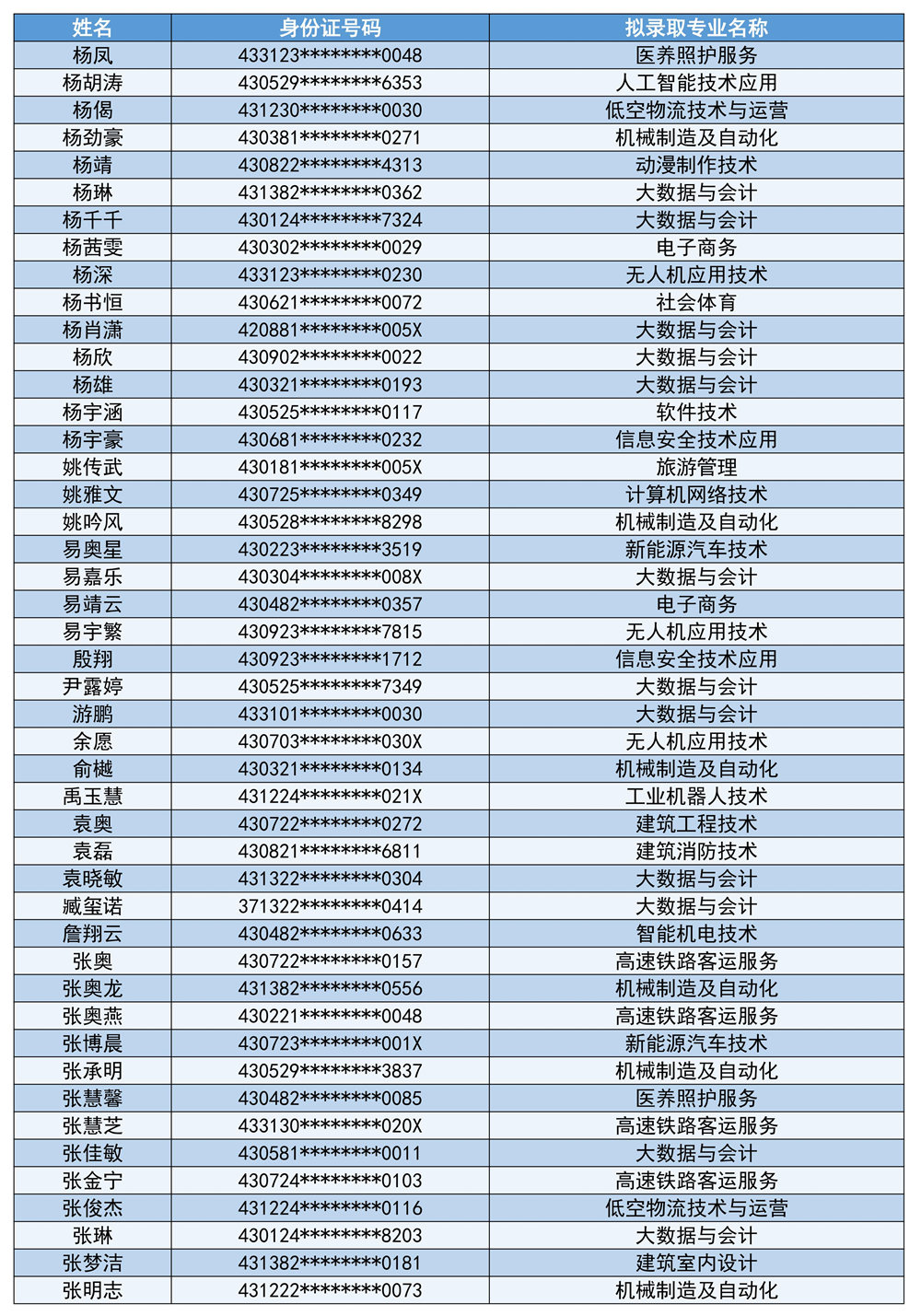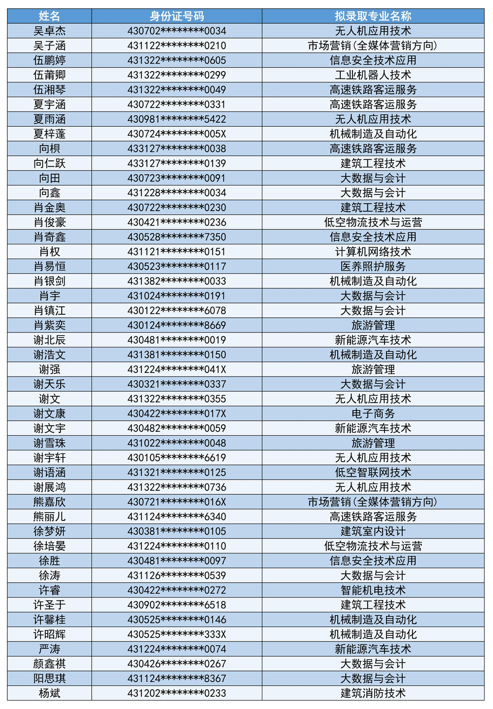 附:长沙南方职业学院2026年单独招生考试第二志愿拟录取名单