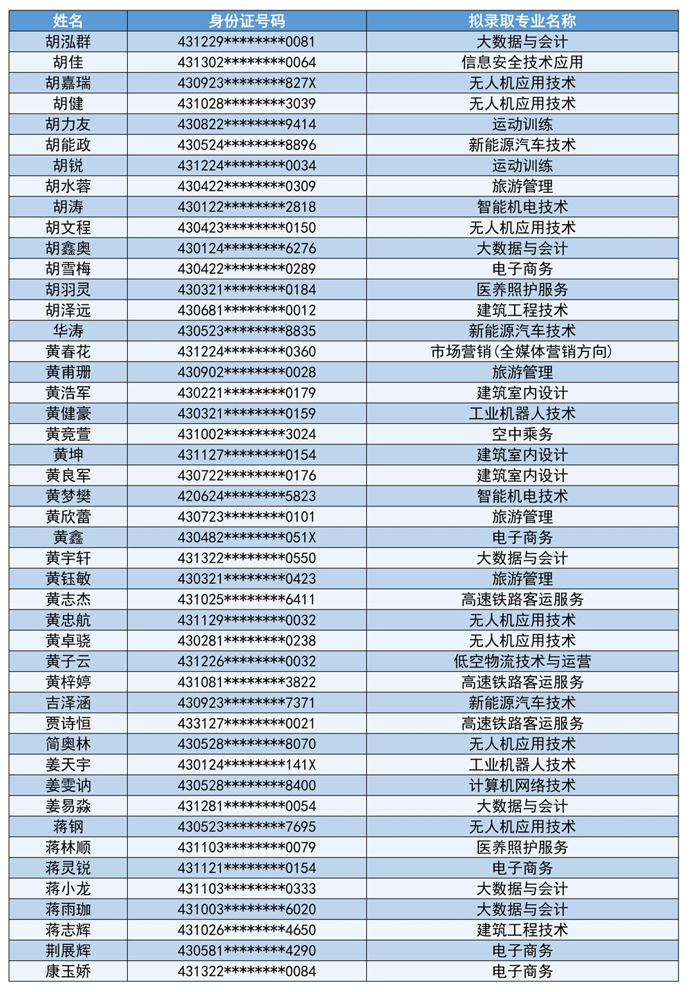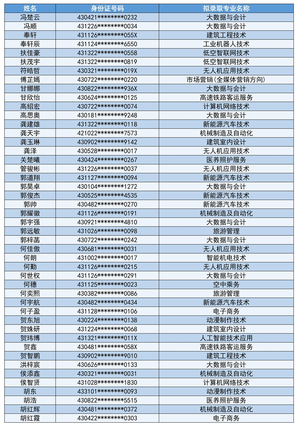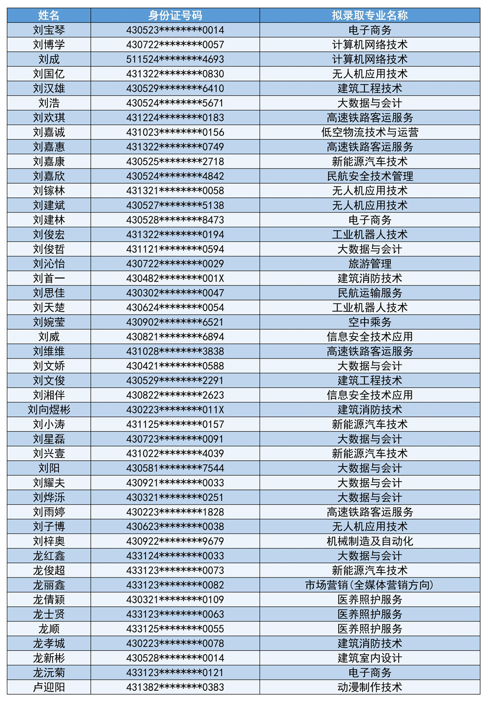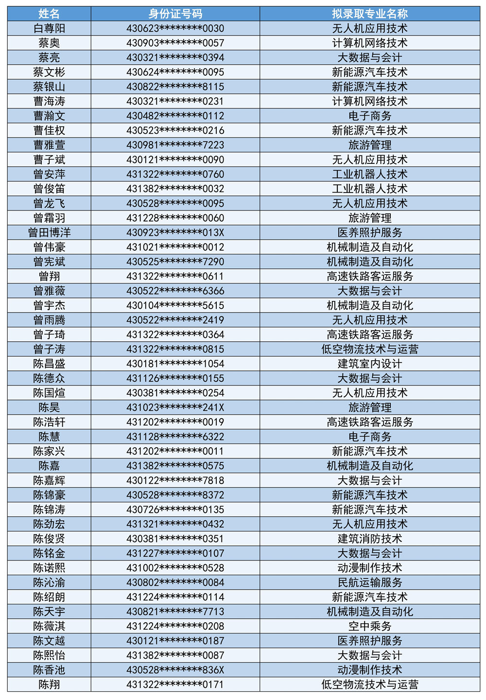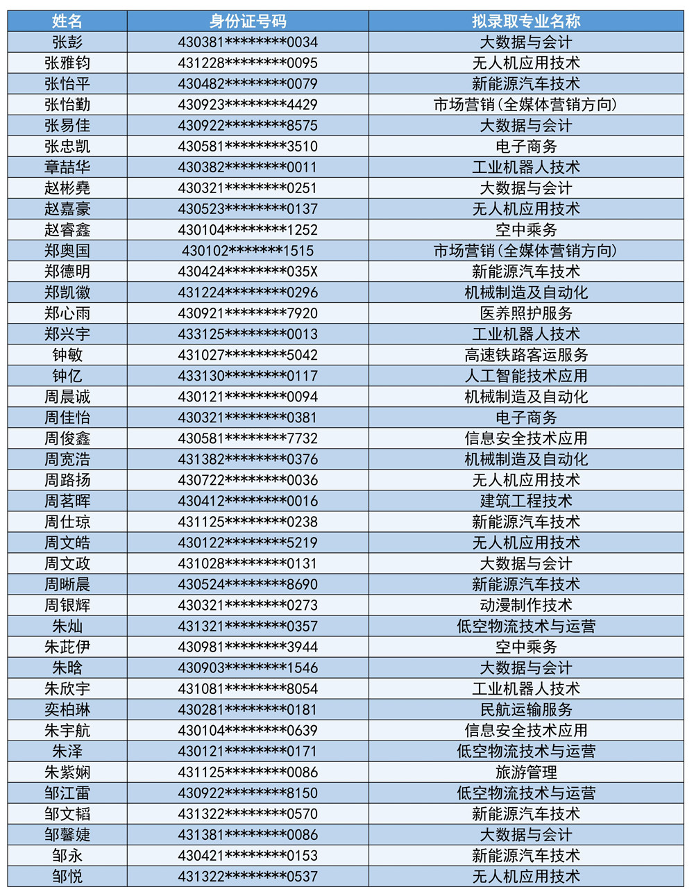 附:长沙南方职业学院2026年单独招生考试第二志愿拟录取名单