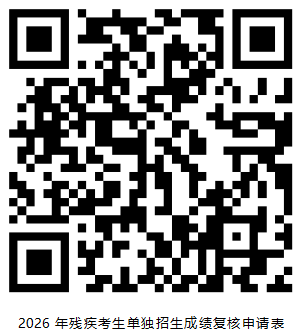 考生本人若对成绩有异议,需向招生就业处提出成绩复核申请,申请复核考生按要求填写《山东特殊教育职业学院2026年残疾考生单独招生成绩复核申请表》(识别下方二维码下载),将填写后的《山东特殊教育职业学院2026年残疾考生单独招生成绩复核申请表》、考生本人身份证及准考证照片,发送至邮箱t87198317@126.com(邮件主题命名为:学制+姓名+报考专业),我院仅通过邮件受理申请,不受理现场、电话等其他方式的申请,未按要求提交申请的不予受理。