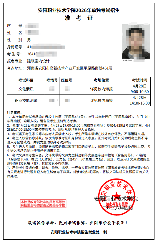 凡报名成功的考生请于4月28日前在学校官网自行打印准考证(网址https://dz.ayzy.edu.cn/),参加4月28日考试的学生,4月27日17:00-18:00可来校查看考场;参加4月29日考试的学生,4月28日17:00-18:00可到校查看考场,准考证打印方法如下: