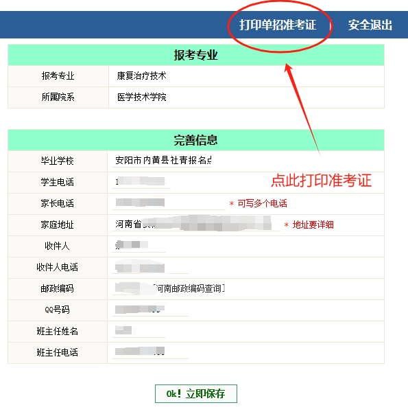 4.填充完个人信息后,点击保存,就可以打印准考证了.