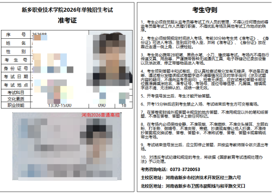 考生自行打印新乡职业技术学院2026年单独招生考试准考证。