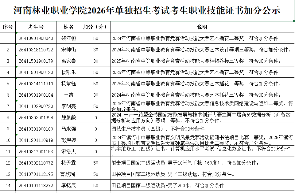 根据《河南省教育厅关于做好2026年高等职业教育单独考试招生和技能拔尖人才免试入学工作的通知》(教学〔2026〕34号)文件精神,按照《河南林业职业学院2026年单独考试招生章程》有关规定,经考生本人申请,现对考生职业技能证书加分情况进行公示: