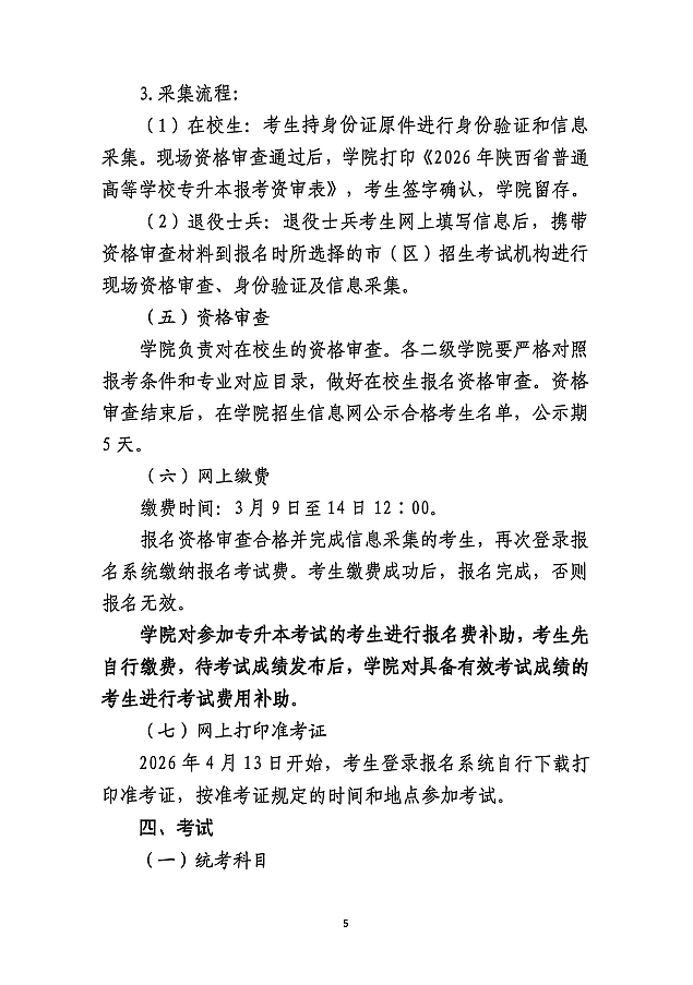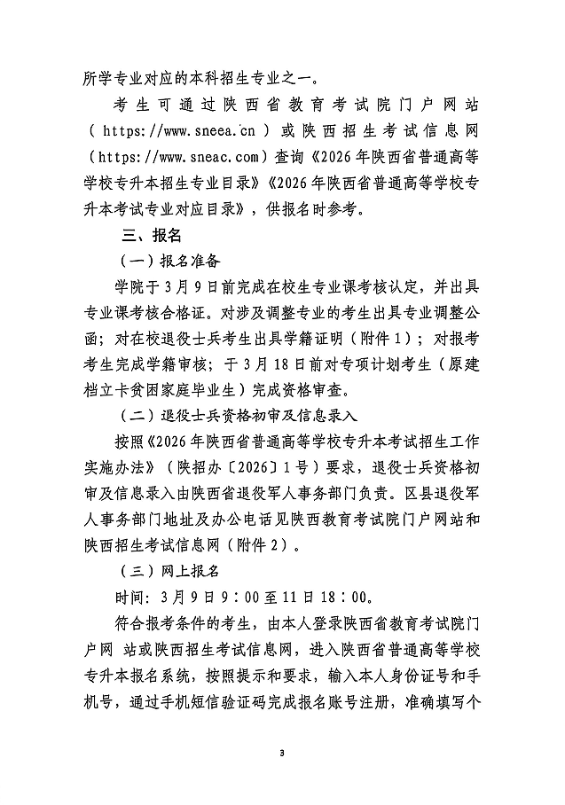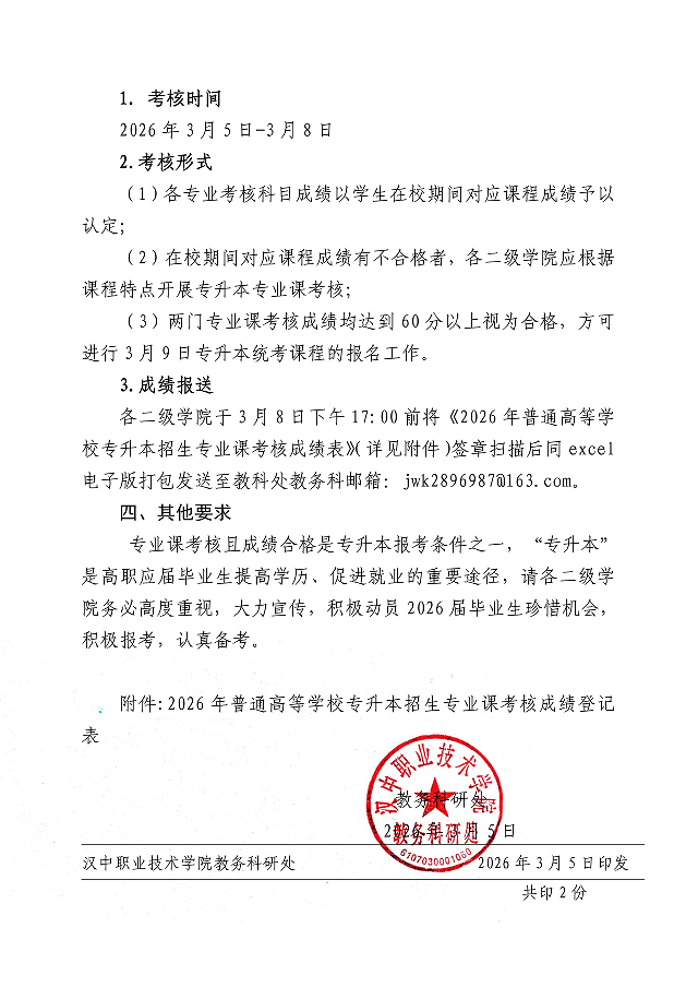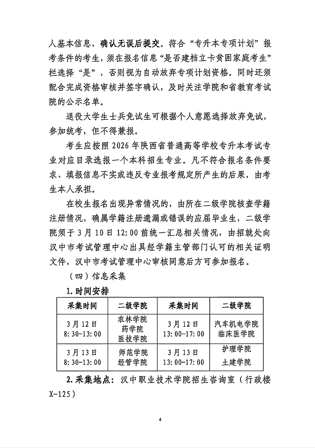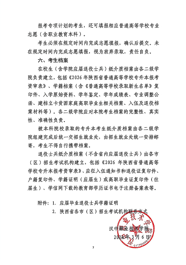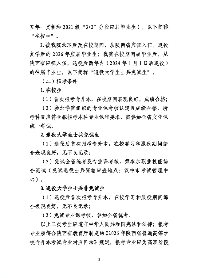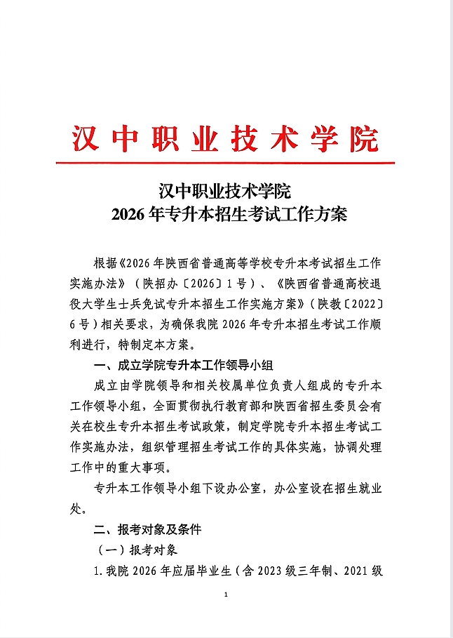 汉中职业技术学院 2026年专升本招生考试工作方案