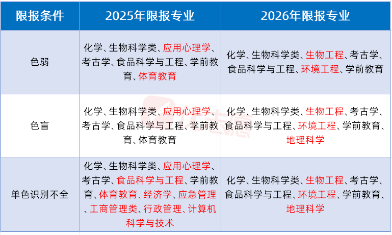 今年三类色觉异常考生的限报专业均新增了生物工程、环境工程,同时删除了体育教育、应用心理学。单色识别不全考生的限报范围大幅缩小,经济学、应急管理、工商管理类、行政管理等专业被移出限报清单,更聚焦于对颜色辨识有明确技术要求的理学、工学、历史学及学前教育等专业领域。