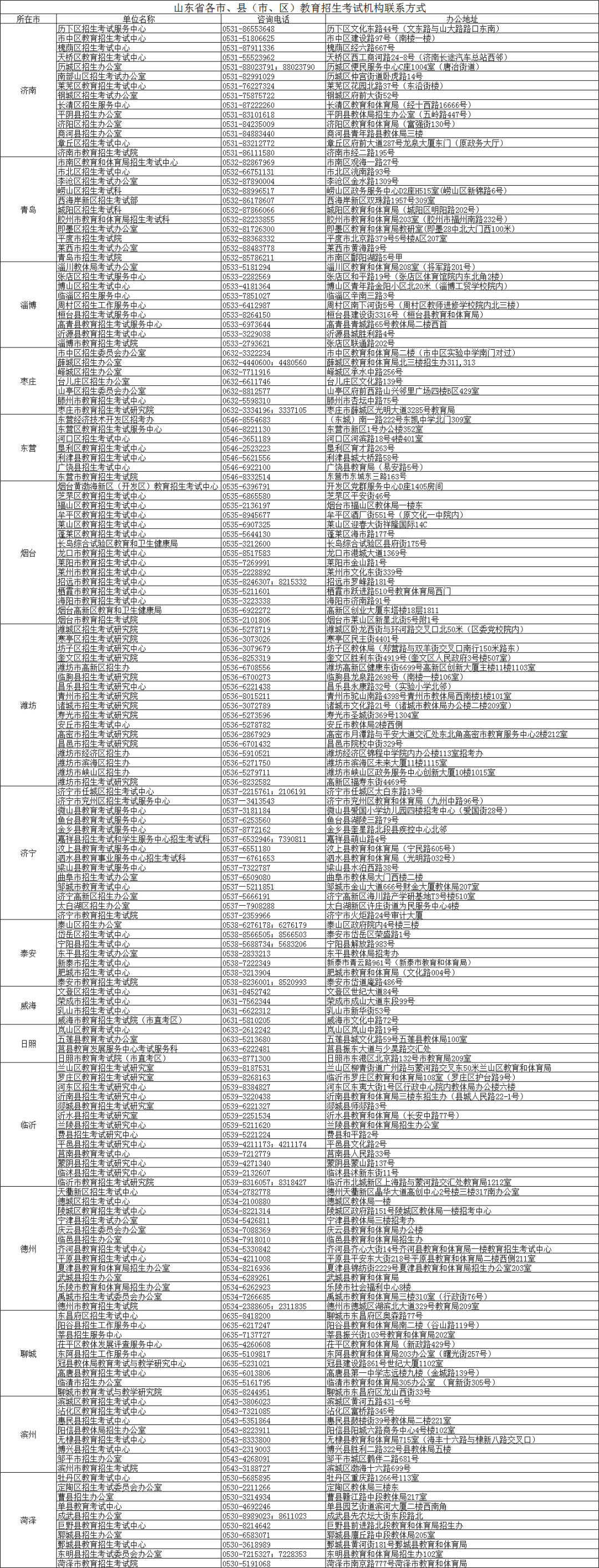附件:山东省各市、县(市、区)教育招生考试机构联系方式