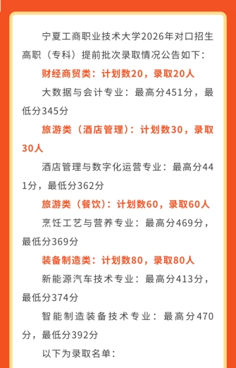 宁夏工商职业技术大学2026年招生录取公告(一)