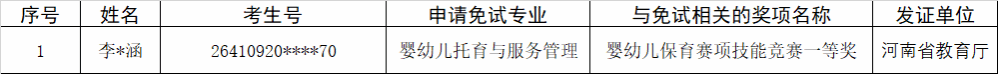 根据《河南省教育厅关于做好2026年高等职业教育单独考试招生和技能拔尖人才免试入学工作的通知》(教学〔2026〕34号)和《河南质量工程职业学院2026年单独招生章程》文件中对“技能拔尖人才免试入学”的规定,经学院认定,报省教厅职业教育与成人教育处备案,以下同学符合免试入学条件,现进行公示。