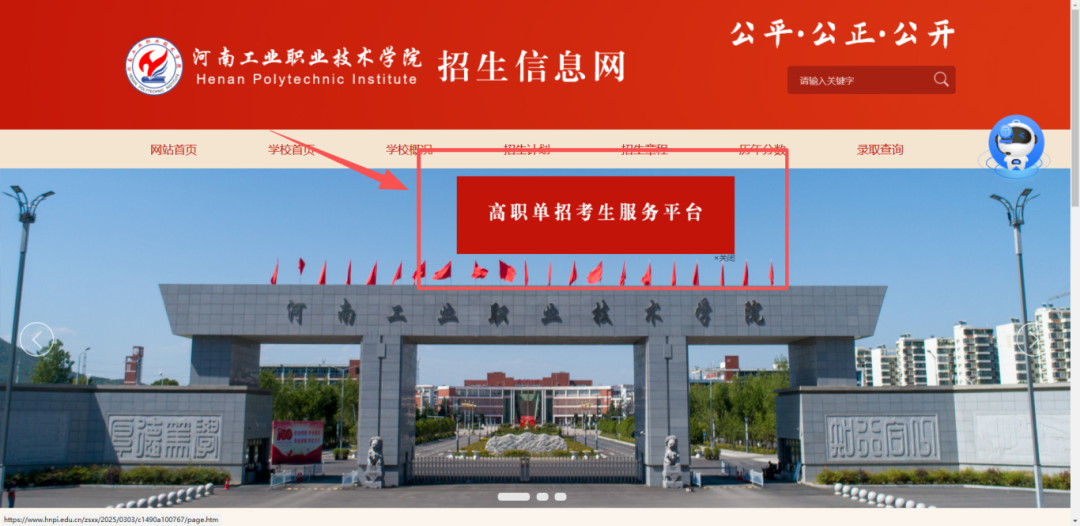 01 打开学校招生信息网登录学校招生信息网http://www.hnpi.edu.cn/zsxx/,找到“高职单招考生服务平台”飘窗,如下图