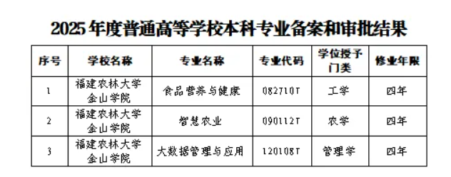 福建农林大学金山学院申报的食品营养与健康、智慧农业、大数据管理与应用3个本科专业,成功通过教育部备案和审批,计划于2026年秋季招生。此次新增专业进一步拓宽了学院专业覆盖范围,优化了专业布局,截至目前,学院本科专业总数增至32个,将更好地对接食品、农业、数字产业发展需求,培养应用型复合人才。