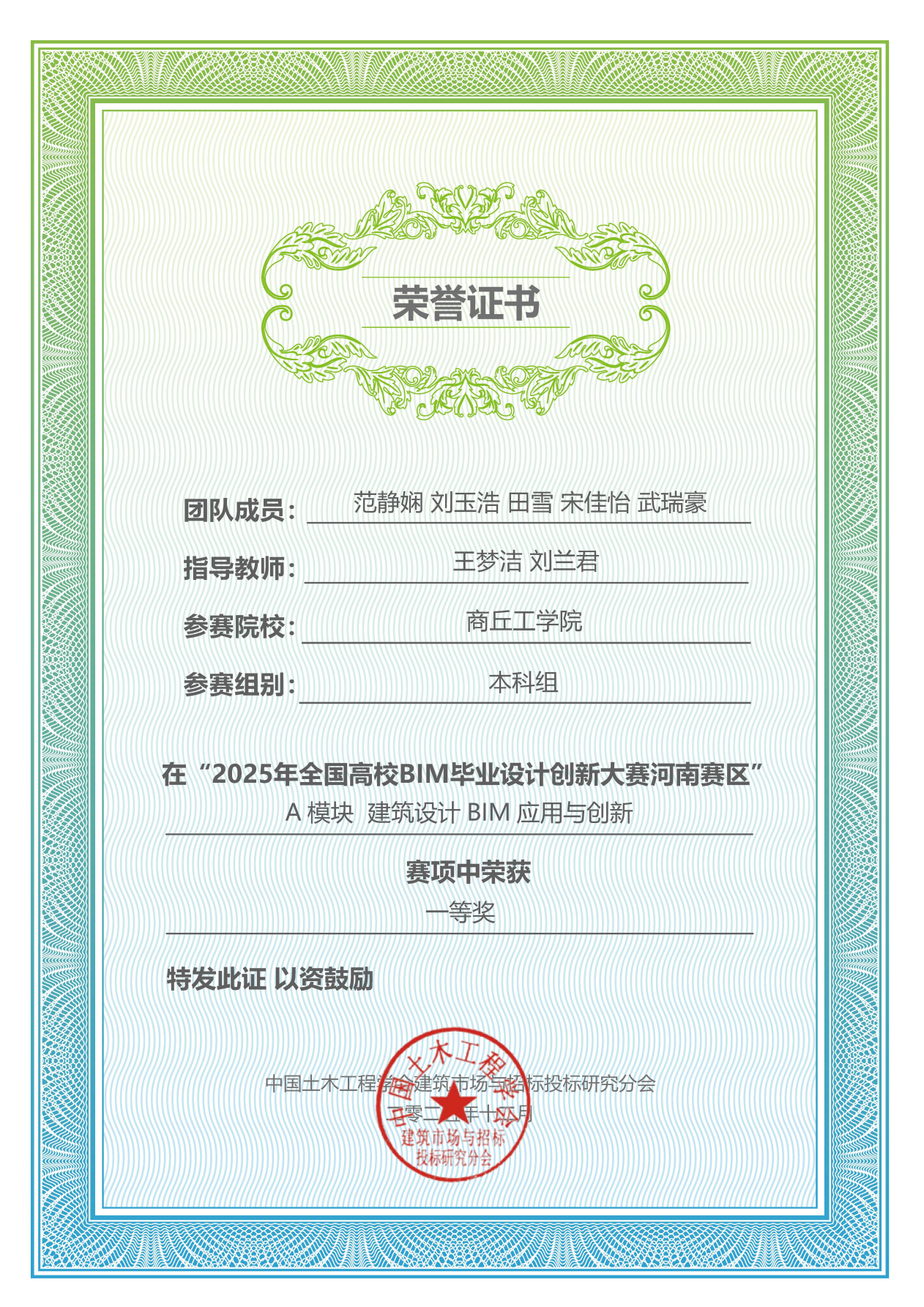 2025年全国高校BIM毕业设计创新大赛河南赛区荣获一等奖