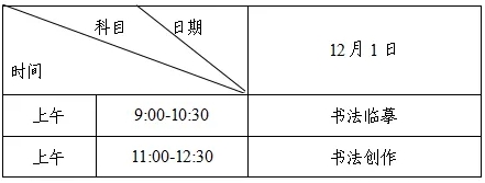 考试时间统一安排在2024年12月1日。全省考生随机编排在长沙市内若干考点,具体考试地点安排见《专业考试证》。毛笔、墨汁等考试用具由考生自备。考生须在11月30日下午17:00-18:00前往考试地点熟悉笔试考点情况,查看考室分布示意图、知晓考试注意事项和各项规定,但不能进入考试大楼和警戒线以内。考试时间具体安排如下: