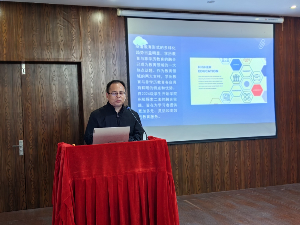副院长孙宝胜在研讨会上做了题为坚持以“学历教育与非学历教育融合的实践思考”主题发言。他详细介绍了学院在探索学历教育与非学历教育不断融合、促进学习路径横纵贯通的思路和方向,总结了2024年学院继续教育和人才培养改革的具体举措。