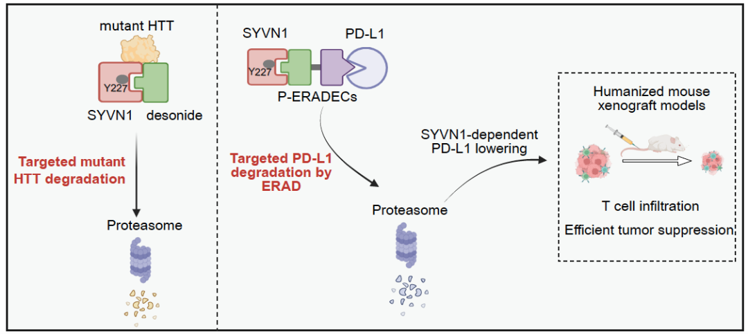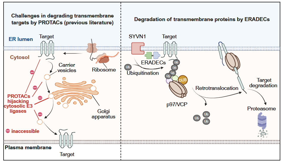 针对上述技术瓶颈,本研究将目光投向另一条长期被忽视的细胞内质量控制系统——内质网相关降解(ERAD)通路,并在此基础上发展了一种靶向该通路的小分子降解策略,命名为ERADEC(ERAD-engaging chimeras)。该策略通过特异性招募定位于内质网的E3泛素连接酶SYVN1,识别并泛素化在内质网折叠完成的跨膜蛋白,进而经由ERAD途径将其引导降解。这一机制为膜蛋白靶点的干预提供了全新思路和技术路径。